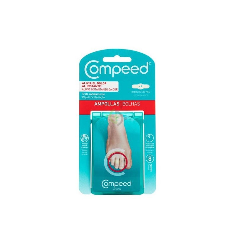COMPEED AMPOLLAS HIDROCOLOIDE DEDOS PIE 8 UDS Los apósitos Compeed Ampollas Dedos Pies, con su tecnología hidrocoloide actúan como una segunda piel formando un gel protector que ayuda a curar las ampollas en los dedos de los pies y previenen su aparición: - Alivio instantáneo del dolor de las ampollas. - Protege frente la presión y las rozaduras. - Rápida cicatrización de la herida. - Resiste el agua (sella higiénicamente la herida evitando la infección). - Ultra-finos y discretos. - Permanece en su sitio sin moverse durante varios días. INDICACIONES - Reduce instantáneamente el dolor de las ampollas. - Protege y amortigua el rozamiento. - Permite una rápida cicatrización. - Permanece en su lugar durante varios días, pudiendo variar de unas personas a otras. UTILIZACIÓN Limpiar y secar la piel antes de la aplicación. Evitar tocar el adhesivo del apósito. Mantener el apósito en su sitio adherido varios días. Diabéticos: consulte con su médico antes de su utilización. Más información en el folleto impreso en el interior del estuche.