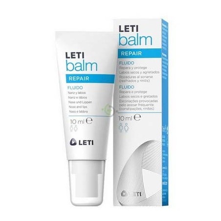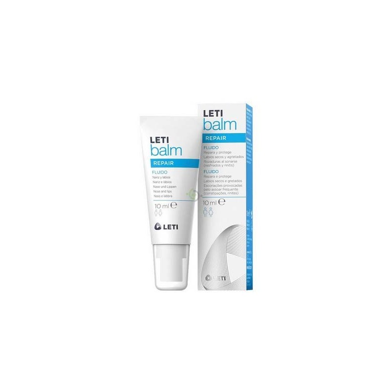LETIBALM FLUIDO NARIZ Y LABIOS 10 ML. Primer bálsamo reparador para nariz y labios. Acción reparadora intensa, emoliente, hidratante y protectora. Indicaciones Cuidado de zonas alteradas de nariz y labios en resfriados o procesos catarrales o riníticos. Rozaduras causadas por el uso excesivo de pañuelos. Alteraciones por frío y viento. Labios agrietados. No emplear en niños menores de 3 años.