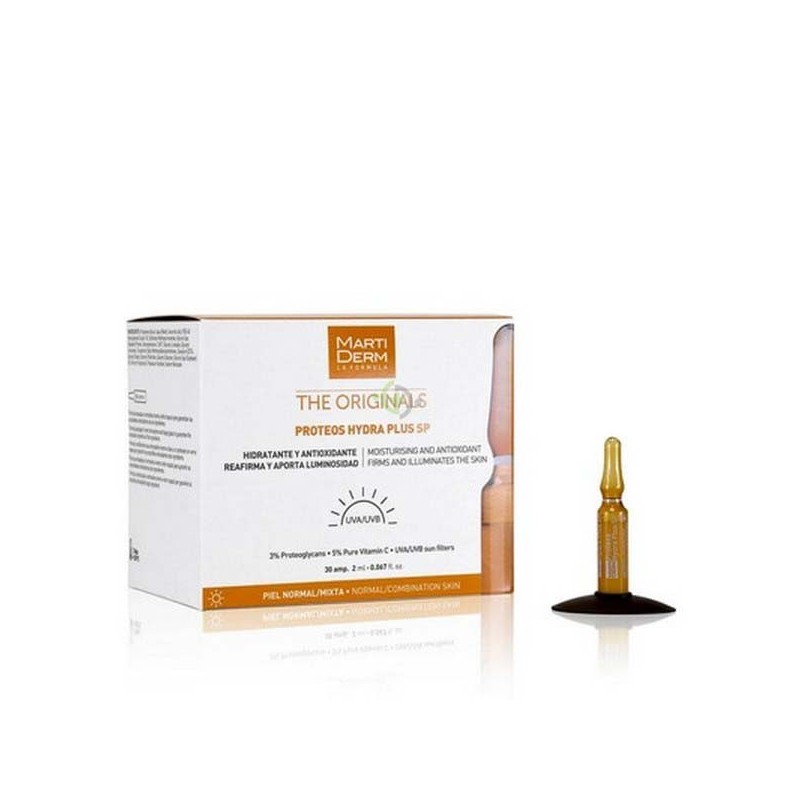 MARTIDERM PROTEOGLICANOS SPF15 30 PIEL SECA - MIXTA AMPOLLAS Martiderm Proteoglicanos SPF15 es un Tratamiento de las arrugas de cara y escote, sequedad cutánea, flacidez y otras manifestaciones del fotoenvejecimiento cutáneo. Con filtros solares UVA y UVB 15. - Corrección paulatina de las arrugas gracias al poder reparador del proteoglicano. - Prevención contra la formación de nuevas arrugas gracias al poder antioxidante de la Vitamina C pura. INDICACIONES - Pieles secas a mixtas. - Reafirman e hidratan. Eliminación paulatina de las arrugas. - Uso tópico: cara y escote INNOVACIÓN Pueden aplicarse como recurso inmediato cuando se quiere dar una apariencia de tersura y luminosidad. UTILIZACIÓN Aplicar diariamente la solución sobre cara y escote mediante un ligero masaje con las yemas de los dedos, insistiendo en las zonas más afectadas hasta su completa absorción. Pasados 10 minutos de la aplicación, puede retirarse el exceso de líquido que no se haya absorbido con un algodón desmaquillador y aplicarse una crema de día o el maquillaje habitual. El contenido de la ampolla, una vez abierta puede utilizarse durante 2 días teniendo siempre la precaución de cerrar el tubo con uno de los tapones que vienen en el blíster y guardarlo en lugar fresco, seco y al abrigo de la luz, para evitar la oxidación de la solución.