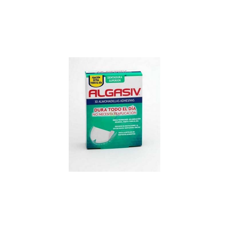Algasiv almohadillas adhesivas para la dentadura superior. Sujeción garantizada todo el día sin molestias ni irritaciones. Acomodan perfectamente la dentadura a las encías. No tiene olor ni sabor, no desprende sustancias y se limpia facilmente.