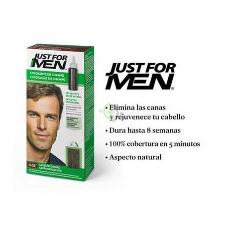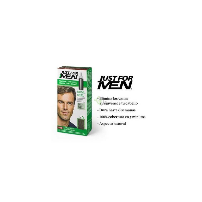 JUST FOR MEN COLORANTE CASTAÑO OSCURO CHAMPU 30 ML Just for Men Champú actúa sólo sobre las canas, cubriéndolas con tonos que se igualan con tu color natural de pelo. Actúa fácilmente en sólo 5 minutos, y puede durar hasta 6 semanas. La fórmula de Just For Men no contiene amoníaco. INDICACIONES - Contiene diaminofenol, resorcinol, alfa-naftol y agua oxigenada. - Puede provocar reacción alérgica. - Evitar el contacto con los ojos. - En caso de contacto, lavarlos con abundante agua fría. UTILIZACIÓN Mezclar los productos y agitar. Aplicar sobre cabello seco y dejar actuar durante 5 minutos. Aclarar y secar.