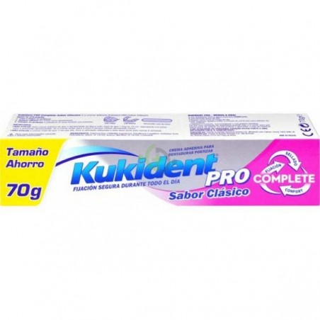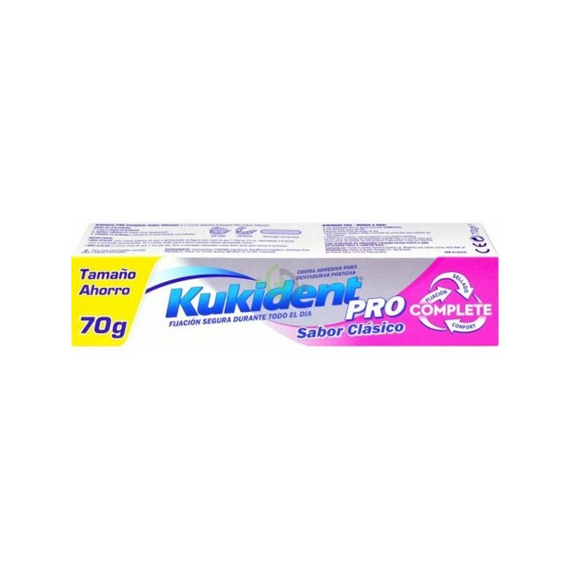 KUKIDENT COMPLETE PRO CLASICO 70 GR La fórmula única de Kukident Pro Complete te da fijación extra fuerte durante todo el día, efecto sellado que ayuda a prevenir las partículas de comida bajo la dentadura y mejora el confort al llevarla gracias a la amortiguación entre encías y dentadura. INDICACIONES - Con una boquilla aplicadora de precisión para masticar sin preocupaciones. - Con un suave sabor mentolado. - Sin sabor. - Proporciona una sensación de seguridad al hablar, reír y comer de modo que puede dejar de pensar en la dentadura y disfrutar de la vida al máximo. UTILIZACIÓN Limpiar y secar la dentadura, aplicar Kukident a la dentadura en finas líneas (como se muestra en el dibujo). Introducir la dentadura en la boca y sujetarla firmemente en su lugar.