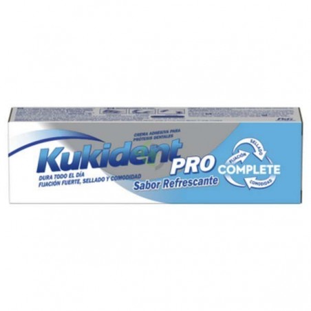 KUKIDENT PRO COMPLETE SABOR REFRESCANTE 47 GR Kukident Pro Complete con Sabor Refrescante te proporciona una fijación extra fuerte durante todo el día.Con un efecto sellado ayuda a prevenir las partículas de comida la dentadura. Mejora el confort al llevarla gracias a la amortiguación entre encías y dentadura. Con una boquilla aplicadora de precisión para masticar sin preocupaciones. INDICACIONES - Con un sabor refrescante mentolado. - No usar más crema adhesiva que la que se muestra en el dibujo de las instrucciones (no más de 1,23 gr o 10 cm, equivalente a 6 tiras de las mostradas). - Si la crema adhesiva rebosa fuera de la dentadura en la boca está usando demasiada. - No usar el producto más de una vez al día. - Con un uso adecuado, un tubo de 47 gr de crema adhesiva durará al menos hasta 5 semanas, mientras que uno de 70 gr durará hasta 8 semanas. - No usar el exceso de producto para fijar dentaduras de forma incorrecta. - No usar más de lo indicado, contiene zinc, consulte a su médico/dentista si usa otros productos que contienen zinc. UTILIZACIÓN Limpiar y secar la dentadura, aplicar Kukident a la dentadura en finas líneas (como se muestra en el dibujo del prospecto interior), e introducir la dentadura en la boca y sujetarla firmemente en su lugar.