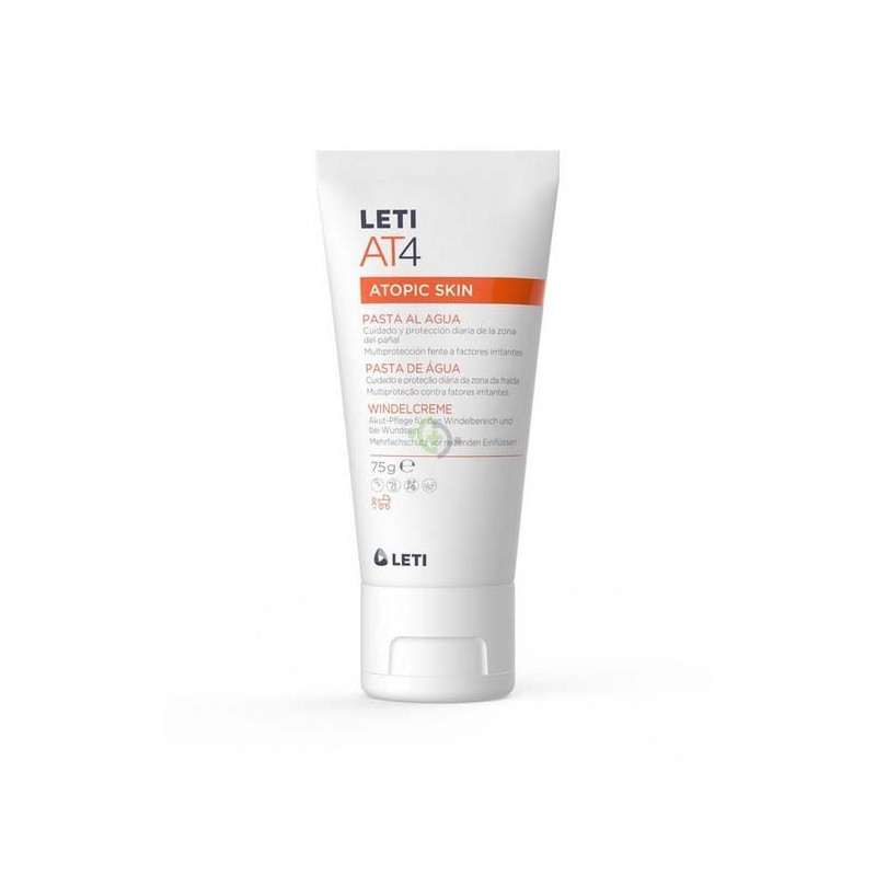 LETI AT-4 PASTA AL AGUA 75 GRS. Fórmula específica para el cuidado dermo-reparador de la epidermis glútea del recién nacido y del bebé con piel delicada o atópica. Su fórmula innovadora combate las principales causas de las irritaciones, escoceduras y rojeces provocadas por el pañal. Características Acción barrera ultraprotectora. Triple acción antienzimática. Reduce el riesgo de sobreinfección. Alivia y repara.