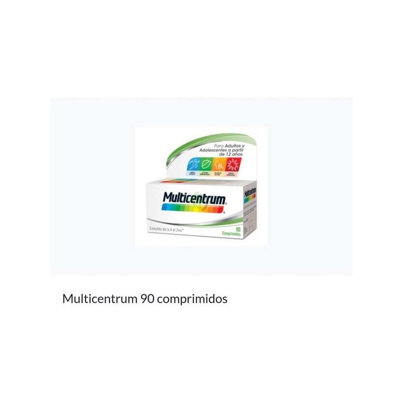 MULTICENTRUM CON LUTEINA 90 COMPRIMIDOS Multicentrum es un complemento alimenticio que contiene vitaminas, minerales y luteína, en una fórmula equilibrada. Un comprimido de Multicentrum al día ayuda a cubrir las necesidades diarias de vitaminas y minerales para adultos y adolescentes (a partir de 12 años). INDICACIONES Multicentrum, se presenta en envases de 30, 60 y 100 comprimidos recubiertos fáciles de tragar, o bien en envases de 20 comprimidos efervescentes para ser disueltos en agua. - Libera energía: Con tiamina, riboflavina (vitamina B2), vitamina B6, vitamina B12, niacina, biotina, ácido pantoténico y hierro, que ayudan al metabolismo energético normal. El hierro contribuye al transporte normal del oxígeno en el cuerpo. - Sistema inmunitario: Con vitamina C, selenio y zinc que contribuyen al funcionamiento normal del sistema inmunitario. - Salud de la piel: Con vitamina A y biotina que contribuyen al mantenimiento de la piel en condiciones normales. La vitamina C contribuye a la formación normal de colágeno para el funcionamiento normal de la piel. - Estrés ambiental: Con vitaminas C, E y selenio que contribuyen a la protección de las células frente al daño oxidativo. - No superar la dosis diaria recomendada. - Es importante mantener una dieta variada y equilibrada además de un estilo de vida saludable. - Los complementos alimenticios no deben ser utilizados como sustituto de una dieta variada y equilibrada. - Como media de seguridad, el bote se encuentra sellado con una lámina de aluminio. - No tome el producto si se encuentra dañada. - Mantener fuera del alcance de los niños. - Después de cada uso, asegúrese de que el bote se encuentra cerrado y guardado dentro de su caja, en un lugar seco y a una temperatura inferior a 25ºC. UTILIZACIÓN Tome 1 comprimido al día.