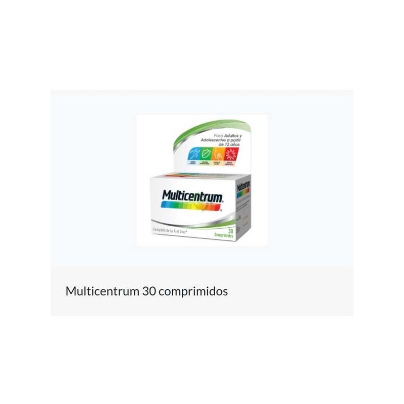 INGREDIENTES : Multicentrum con luteína: Fosfato cálcico, Óxido de magnesio, Cloruro potásico, Fumarato ferroso, Óxido de cinc, Sulfato de manganeso, Sulfato cúprico, Ioduro potásico, Lactosa, Cloruro de cromo, Molibdato sódico, Seleniato sódico, Ácido ascórbico, Acetato de tocoferol, Niacinamida, Biotina, Beta-caroteno, Pantotenato cálcico, Vitamina A / Vitamina D acetato, Clorhidrato de piridoxina, Ácido fólico, Cianocobalamina, Mononitrato de tiamina, Riboflavina, Fitonadiona, Luteina, Celulosa microcristalina, Polivinil-pirrolidona, Dióxido de sílice, Ácido esteárico, Estearato magnésico, Hidroxipropilmetilcelulosa, Triacetina, Polisorbato, Colorantes: E171 y E110. Multicentrum con luteína efervescente: Fosfato cálcico, gluconato ferroso, cloruro potásico, sulfato de manganeso, gluconato cúprico, óxido de cinc, selenato sódico, ioduro potásico, molibdato sódico y cloruro crómico. INFORMACIÓN NUTRICIONAL : Por comprimido: Vitamina A (Retinol) 800 mcg Vitamina D3 (Colecalciferol) 5 mcg Vitamina E (Tocoferol) 10 mg Vitamina C (Ácido Ascórbico) 60 mg Vitamina B1 (Tiamina) 1,4 mg Vitamina B2 (Riboflavina) 1,6 mg Vitamina B3 (Niacina) 18 mg Vitamina B6 (Piridoxina) 2 mg Vitamina B9 (Ácido fólico) 200 mcg Vitamina B12 (Cianocobalamida) 1 mcg Biotina 150 mcg Ácido pantoténico 6 mg Vitamina K 30 mcg Luteína 250 mcg Calcio 162 mg Fósforo 125 mg Hierro 14 mg Potasio 40 mg Magnesio 100 mg Cobre 0,7 mg Cinc 7,5 mg Manganeso 2,5 mg Iodo 150 mcg Molibdeno 25 mcg Cromo 25 mcg Cloro 36,3 mg Colina 2 mg Selenio 25 mcg MODO DE EMPLEO : Multicentrum con luteína: Adultos (a partir de 12 años): un comprimido al día acompañado de líquido y preferiblemente con el desayuno. Multicentrum con luteína efervescente: Adultos (a partir de 12 años): un comprimido al día . Dejar disolver completamente el comprimido en medio vaso de agua (125 ml) y beber a continuacuón. PRECAUCIONES Y ADVERTENCIAS : No superar la dosis diaria recomendada. Mantener fuera del alcance y de la vista de los niños. El contenido de lactosa y sacarosa es despreciable. CONSERVACIÓN : Cerrar herméticamente y conservar en ambiente fresco y seco a una temperatura no superior a 25º C. USO EN PACIENTES CON INTOLERANCIA ALIMEN: No disponemos de información específica sobre los posibles efectos de este producto alimenticio en pacientes afectados por alergia y/o intolerancia a alguno de sus ingredientes.