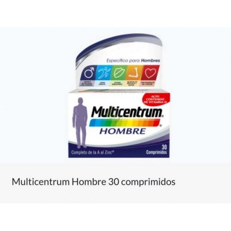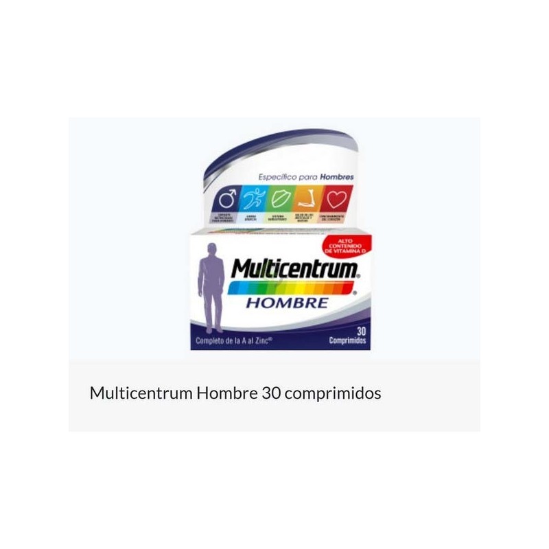 MULTICENTRUM HOMBRE 30 COMPRIMIDOS Multicentrum Hombre es un complemento alimenticio que se presenta en envases de 30 comprimidos, fáciles de tragar. La fórmula de Multicentrum Hombre se basa en los datos científicos más recientes y proporciona múltiples beneficios tales como: - Soporte nutricional para hombres, libera energía, sistema inmunitario, salud de los músculos y funcionamiento del corazón. INDICACIONES Con cantidades reforzadas de vitaminas minerales que ayudan a satisfacer las necesidades nutricionales específicas de los hombres. Contiene tiamina, riboflavina (vitamina B2), vitamina B6, vitamina B12, niacina, biotina, ácido pantoténico y hierro, que ayudan al metabolismo energético normal. - Con vitamina C, selenio y zinc que contribuyen al funcionamiento normal del sistema inmunitario. - Contiene magnesio y calcio que contribuyen al funcionamiento normal de los músculos. - Con tiamina (vitamina B1) que contribuye a la función normal del corazón. - Mantener fuera del alcance de los niños. UTILIZACIÓN Lea atentamente las instrucciones de uso impresas en el interior del estuche antes de su utilización.