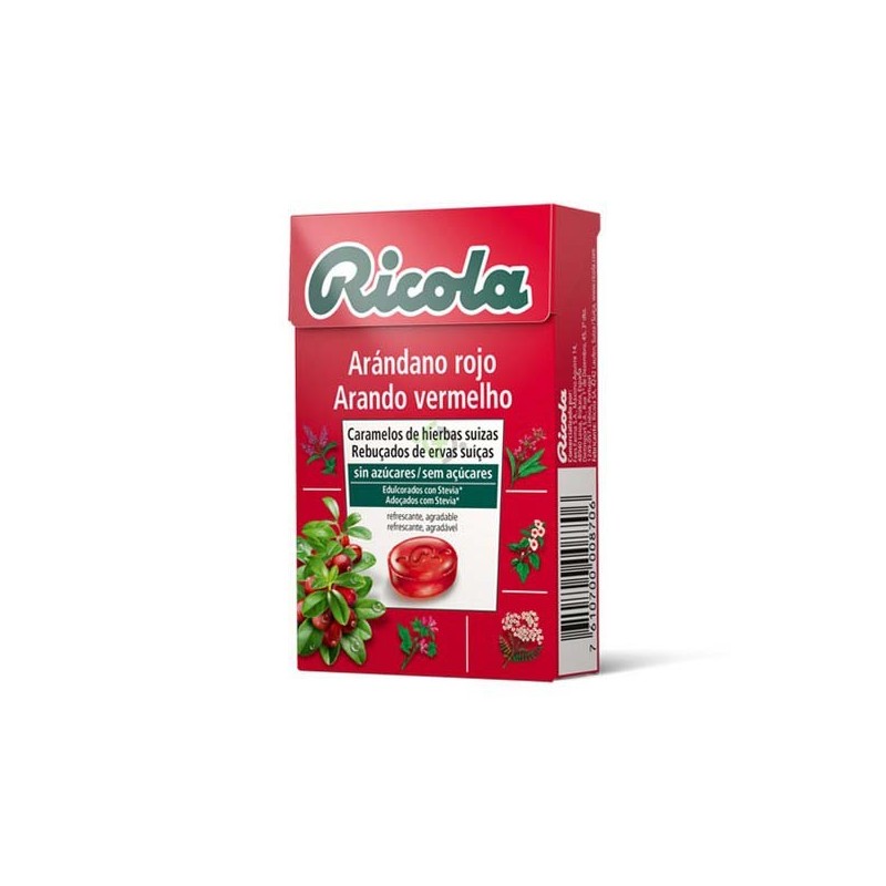 Con una ración extra de vitamina CLos caramelos de arándano rojo Ricola no solo tienen un excelente sabor, sino también beneficiosos efectos. El arándano rojo procede de Norteamérica y está emparentado con el europeo. Cuando está maduro, es de un intenso color rojo y contiene grandes cantidades de vitamina C, betacaroteno y sustancias minerales. Los indígenas norteamericanos lo sabían y los utilizaban con fines curativos. Nuestros caramelos contienen zumo puro de arándano, así como la eficaz mezcla de 13 hierbas.Las hierbas utilizadas para elaborar estos deliciosos caramelos se cultivan en las montañas suizas de forma biológica, sin fitosanitarios químicos.El delicado arándano rojo confiere a este caramelo de hierbas Ricola su especial sabor ácido afrutado.Información para alérgicos Intolerancia a la lactosa Los productos Ricola no contienen lactosa. Por ello, las personas intolerantes a la lactosa pueden disfrutar sin problemas de las especialidades Ricola. Intolerancia al gluten Todas las especialidades de hierbas Ricola se consideran sin gluten según el Reglamento sobre Alimentos suizo (o Reglamento para el Etiquetado y la Fijación de Precios de los Alimentos). Los consumidores con intolerancia al gluten pueden degustarlas tranquilamente.