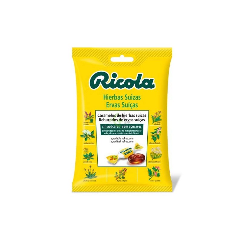 Ricola Caramelos Efecto Balsámicos Hierbas Suizas, 70 g Bolsa: Bolsa de caramelos con sabor a una combinación de 13 hierbas suizas que proporcionan un suave efecto balsámico.Los caramelos de hierbas suizas Ricola contienen el poder de las 13 hierbas. Los clásicos de la gama Ricola se caracterizan por su forma cúbica y su delicioso sabor a hierbas. Desde hace 70 años, Ricola mezcla las 13 hierbas medicinales utilizadas para elaborar esta especialidad suiza siguiendo la misma receta: la mezcla de pimpinela, flores de saúco, verónica, menta, salvia, malvavisco, tomillo, pie de león, marrubio, llantén, flores de primavera, milenrama y malva es muy apreciada por los consumidores de todo el mundo para aliviar los resfriados, la tos y la afonía.Las hierbas utilizadas para elaborar nuestros caramelos se cultivan en las montañas suizas de forma biológica, sin fitosanitarios químicos.Composición:Composición por caramelo (4,2g): azúcar, jarabe de glucosa, extracto de la mezcla de 13 hierbas Ricola 42mg (llantén, malvavisco, menta, tomillo, salvia, pie de león, saúco, primavera, milenrama, pimpinela, verónica, malva, marrubio), colorante (caramelo), mentol 2,6mg, esencia de menta 2,6mg.Advertencias:-Gluten: Según el Codex Alimentarius, el producto no contiene gluten y por lo tanto es apto para personas con intolerancia al gluten.-Lactosa: Según el Reglamento sobre Alimentos Especiales suizo, el producto no contiene lactosa y por lo tanto es apto para personas con intolerancia a la lactosa.Modo de Empleo:Cada vez que se desee, sin una pauta concreta.